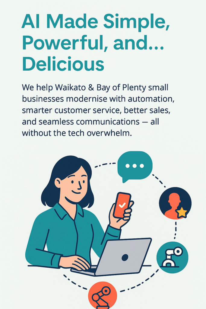 At Delicious AI, we believe technology should work for you — not the other way around. We help small businesses across the Waikato and Bay of Plenty modernise by making Artificial Intelligence simple, approachable, and effective. From streamlining repetitive tasks with smart automation to creating responsive, AI-powered customer service solutions, we put powerful tools in your hands without the complexity. Whether you’re looking to boost sales performance, enhance customer relationships, or integrate all your communication channels into one seamless system, our mission is to make the process smooth, stress-free, and, yes… deliciously rewarding